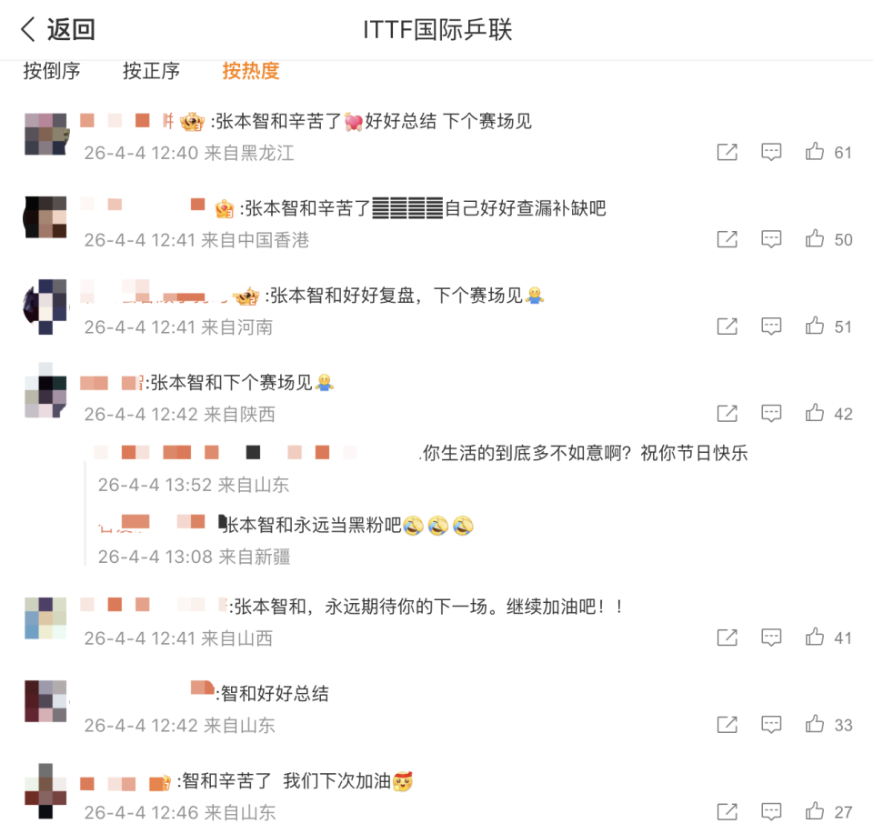国际乒联官方社媒发了张本智和输球的战报。随后,多位中国网友留言:“张本智和辛苦了,好好总结,下个赛场见。”、“张本智和辛苦了,自己好好查漏补缺吧。”、“张本智和好好复盘,下个赛场见。”、“张本智和,永远期待你的下一场。继续加油吧!”