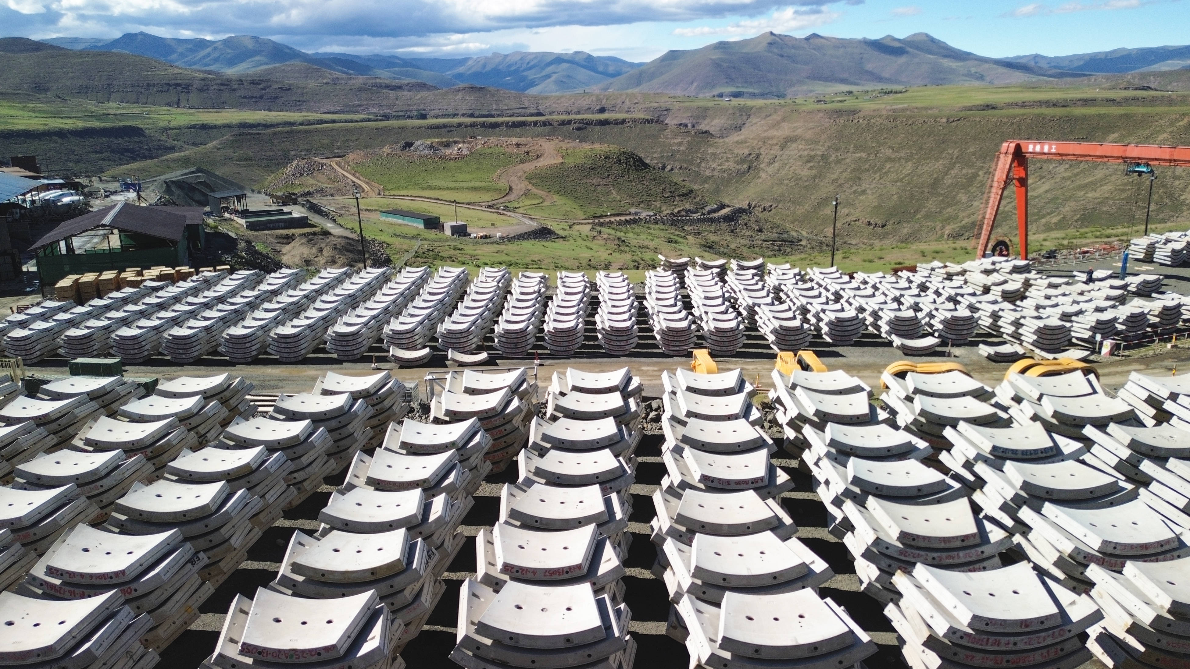 这是3月8日在莱索托东部莫霍特隆拍摄的波利哈利输水隧洞建设项目管片厂(无人机照片)。新华社记者陈为摄高原山区岩层坚硬、埋深大、地质复杂,施工难度极高。“大禹·长锋号”和“大禹·雪盾号”为此安装了重载硬岩刀盘、常态化超前钻机等尖端系统,保障复杂地质环境下高效、安全施工。