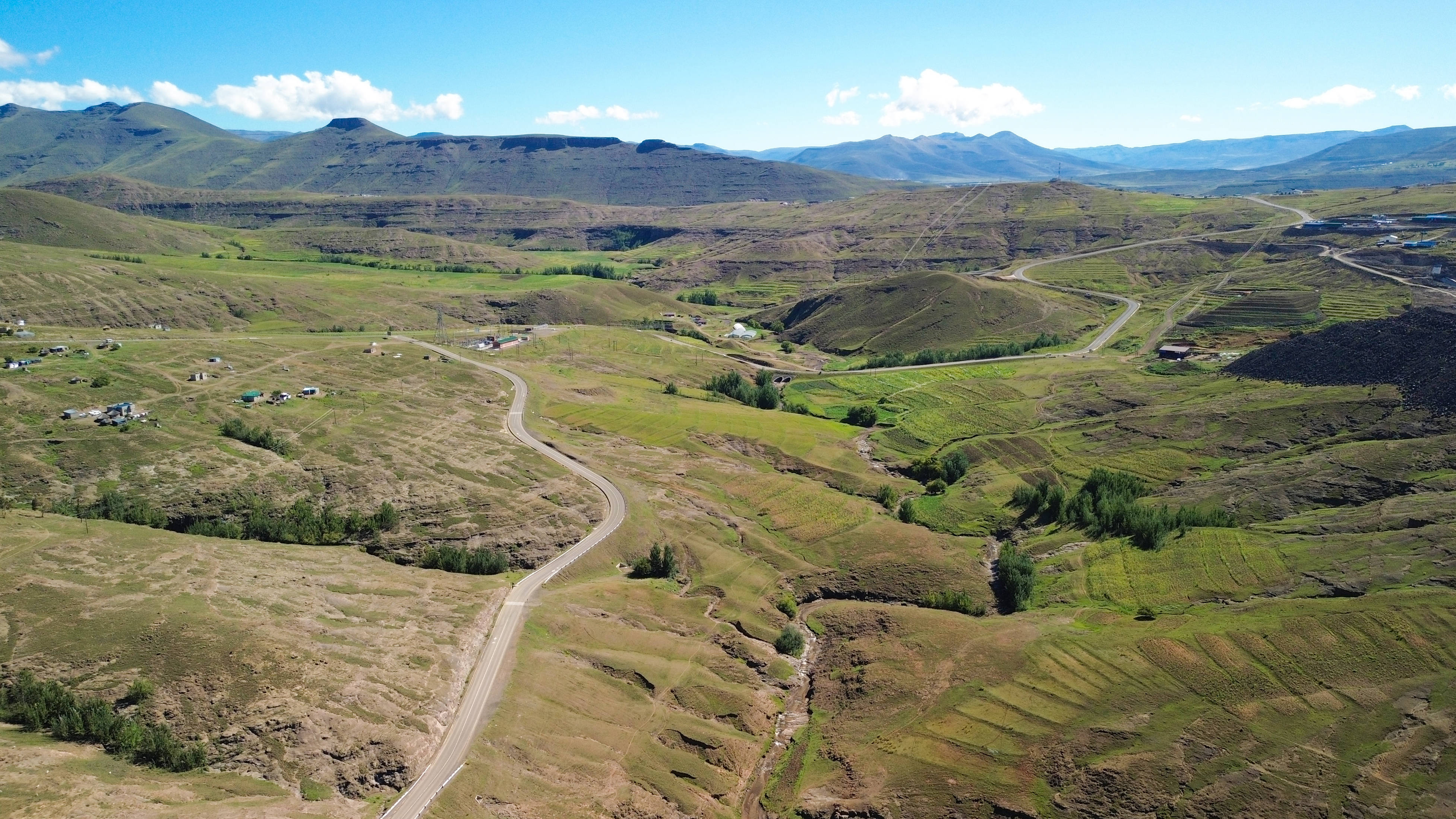 这是3月9日拍摄的莱索托东部莫霍特隆风光(无人机照片)。新华社记者陈为摄自2023年以来,企业还为村庄改善基础设施,从修缮足球场、诊所到新增公厕、托育中心、便民摊棚……村民的生活环境得到持续改善。